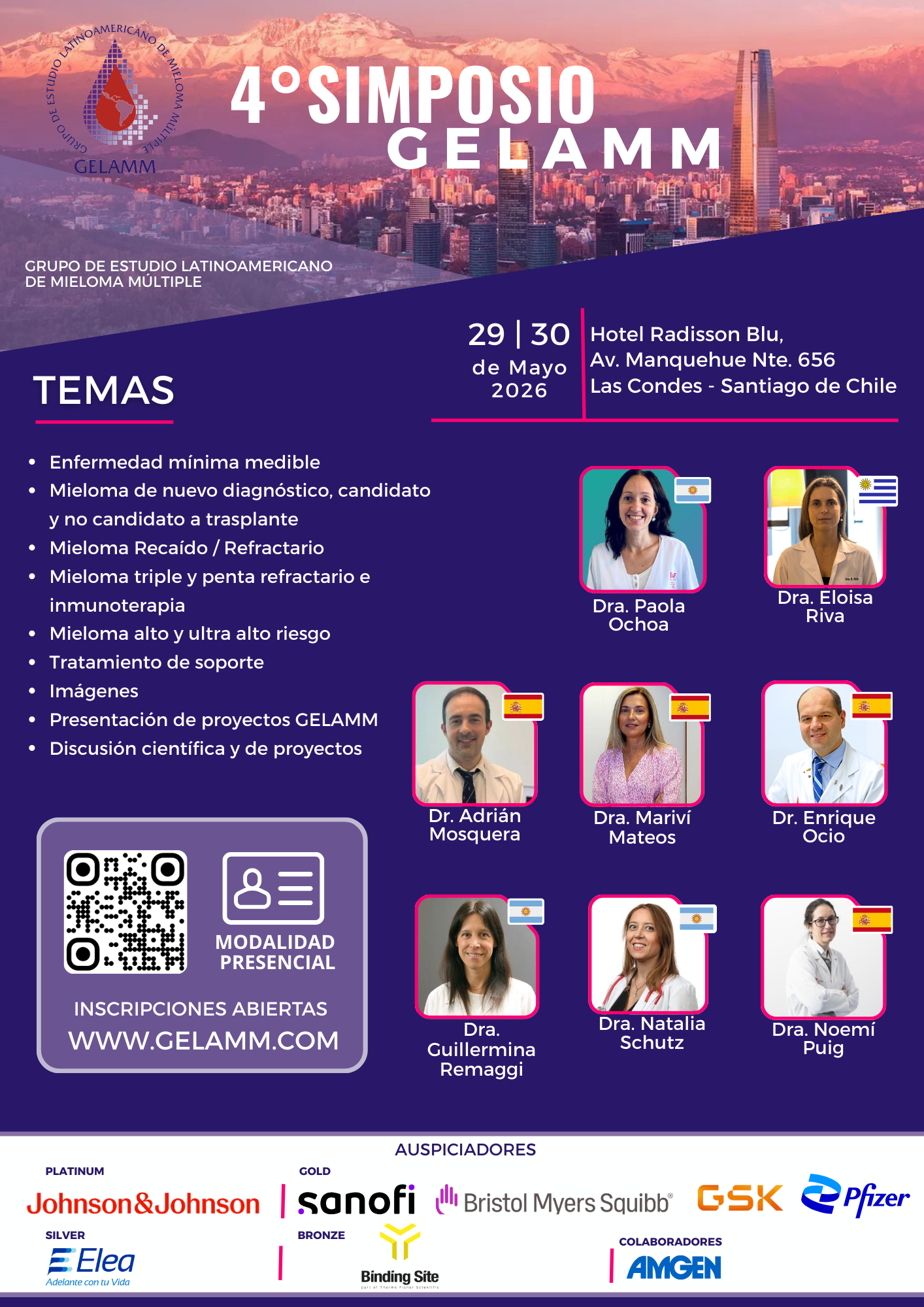 Es un honor para nosotros invitarlos al 4to Simposio del grupo Latinoamericano de estudio de mieloma múltiple, GELAMM, un espacio que se ha consolidado como un punto de encuentro fundamental para el intercambio de conocimientos y experiencias en el ámbito del mieloma múltiple y las gammapatías monoclonales en nuestra región.